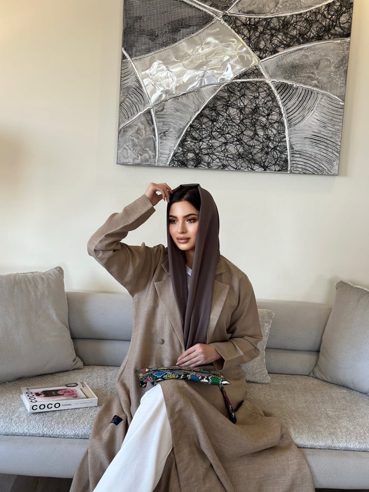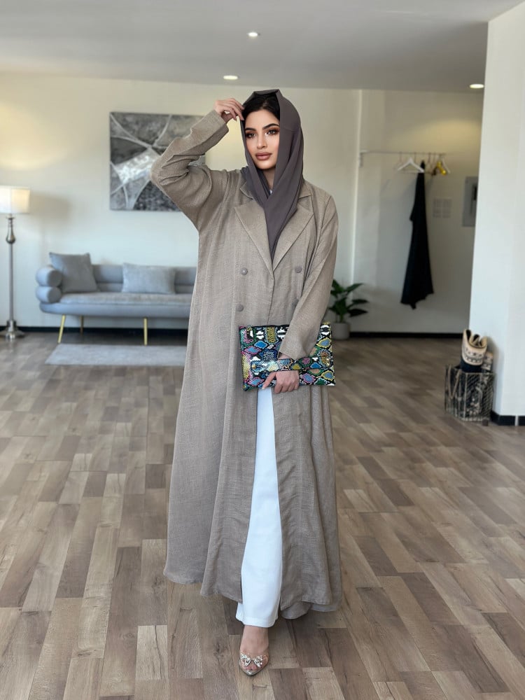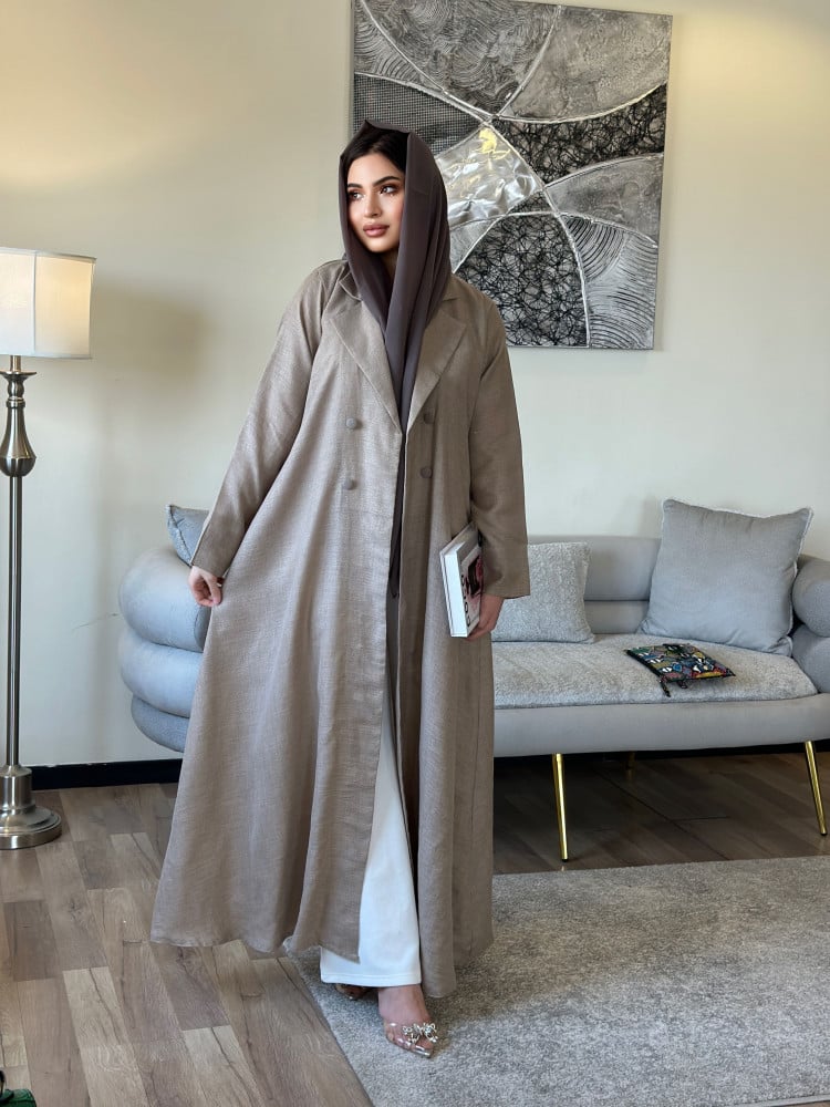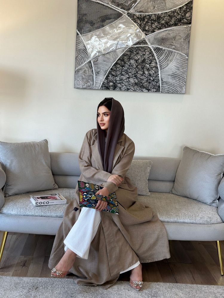 - عباية ملونه تتميز بتصميمها الأنيق والكلاسيكي ولون بيج أنيق و أساسي .